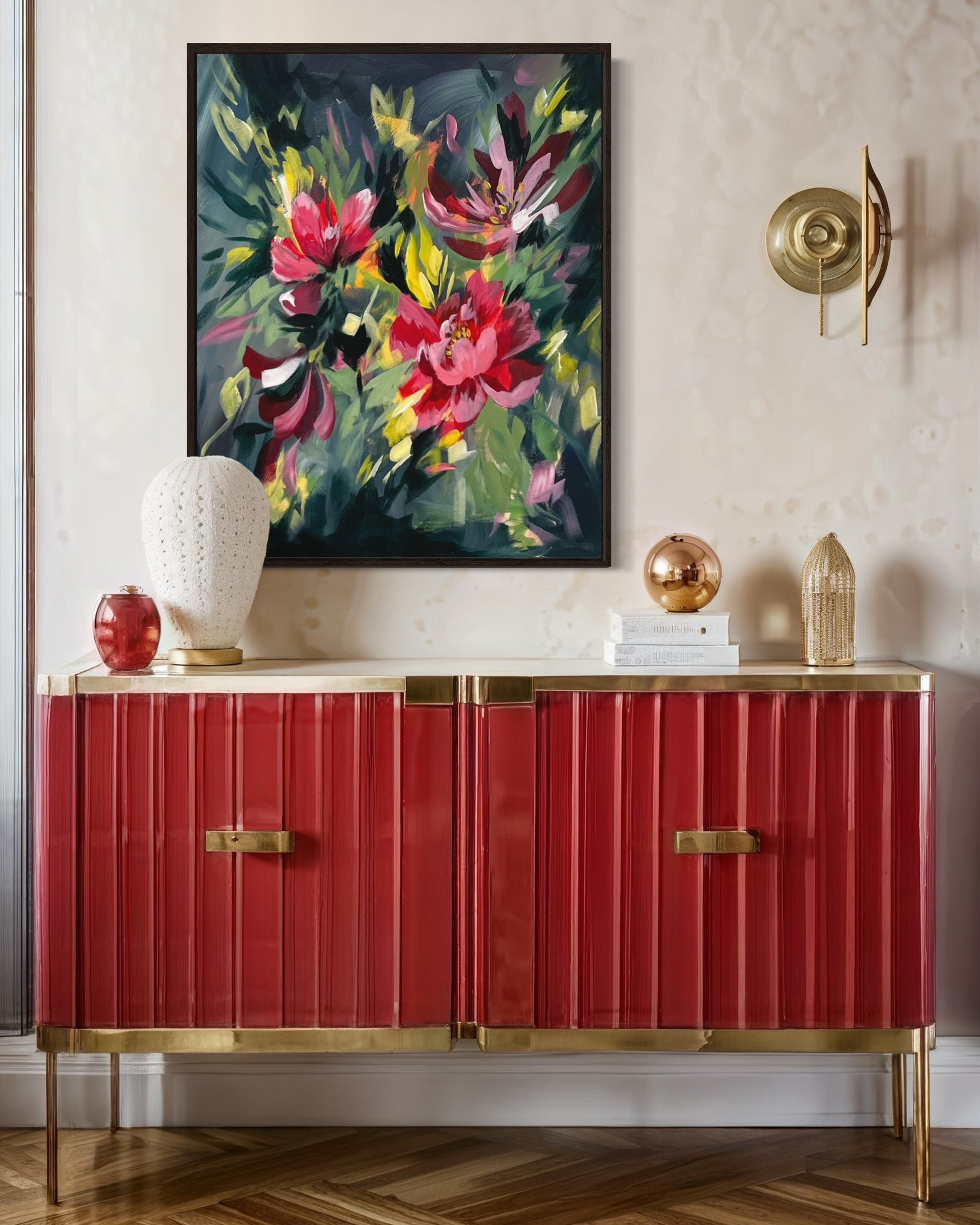 Infuse your space with bold, botanical energy. Garden in Motion captures the drama of deep crimson petals and vibrant greens in sweeping, expressive brushstrokes—a garden alive with movement and light.